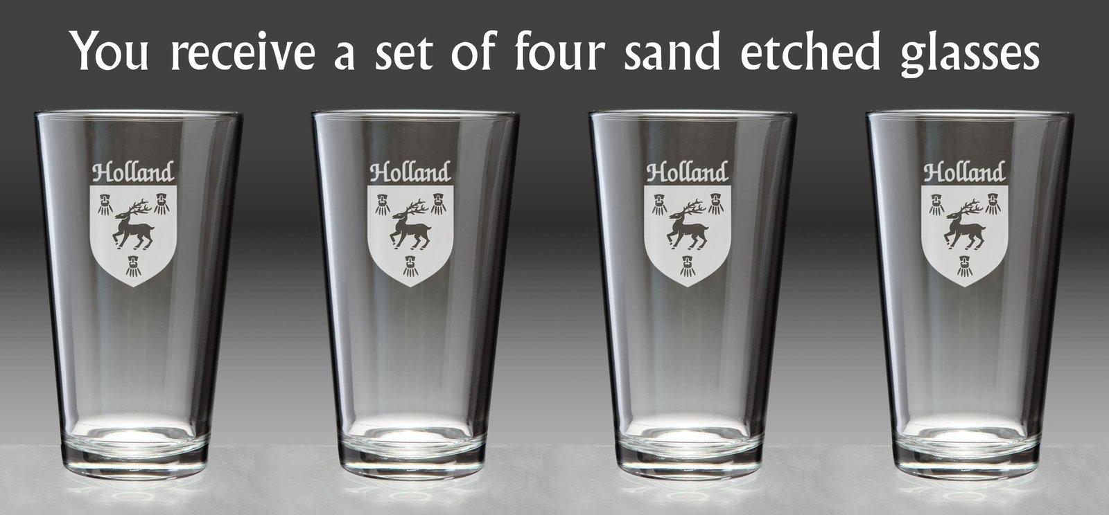 Holland Irish Coat of Arms Pint GlassesDid you know that the standard 20 oz. pint glass is enforced by the National Standards Authority of Ireland? A full Irish pint is a tradition (and a duty). The Irish Rose can etch over 1000 Irish family names and authentic coats of arms on these high-quality, recognizably Irish Pint Glasses. A perfect wedding, groomsman, reunion, any-occasion gift.20 oz., permanently sand-etched authentic Irish coat-of-arms, and dishwasher safe. Choose from over 1000 available family crests.Washing Instructions:Dishwasher and microwave safe. Authentic Irish Family Coat of Arms Over 25 years of Heraldry Research Set of 4 Irish Coat of Arms Pint Glasses (Sand Etched) High quality sand etching with extra heavy base capacity: 20 Ozmaterial: Glassproduct height: 6-3/8"bottom diameter: 2-1/2"top diameter: 3-3/4"