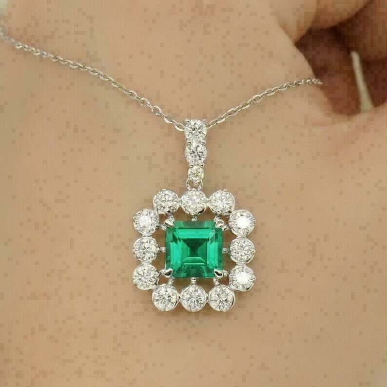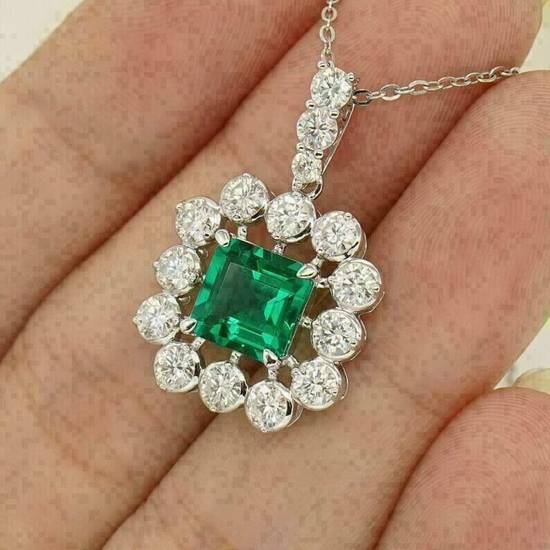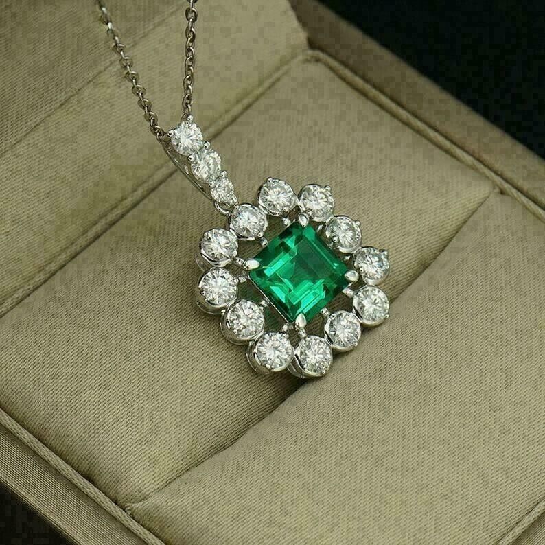 2Ct Princess Cut CZ Emerald Retro Vintage style Pendant 14K White Gold Plated