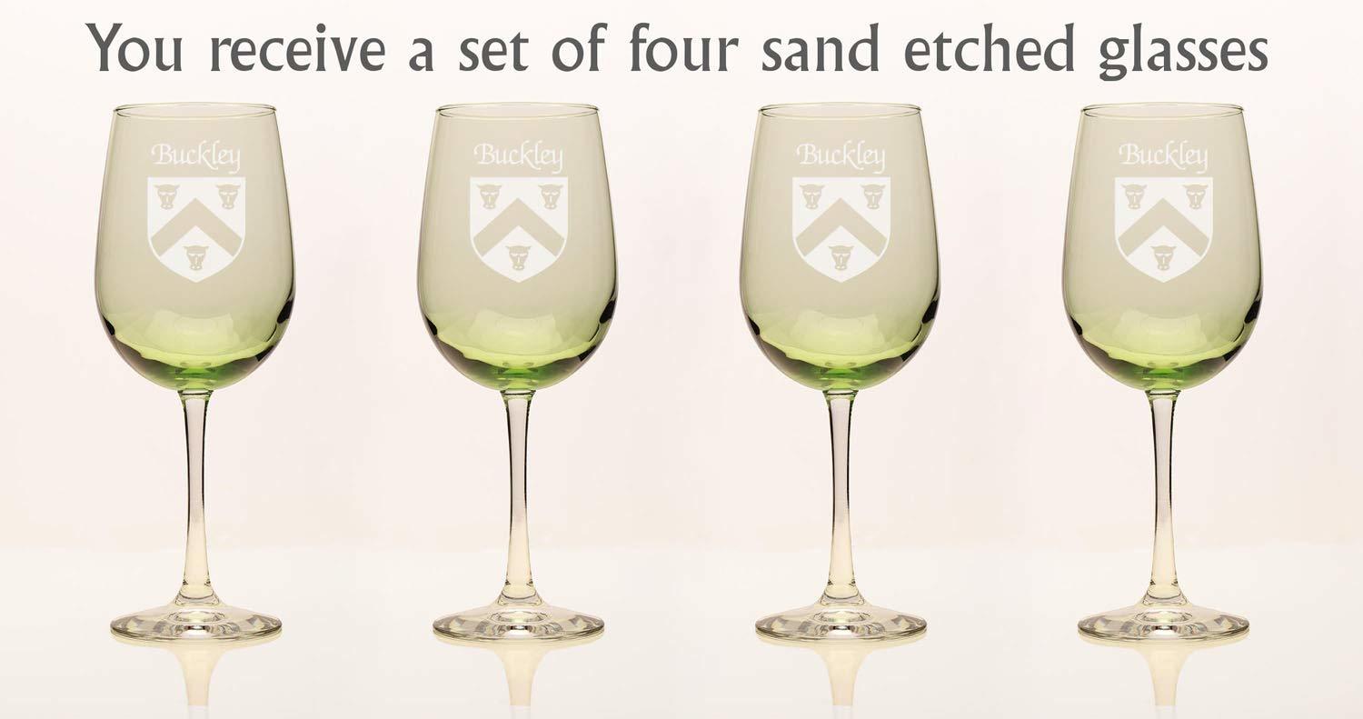 Buckley Irish Coat of Arms Green Wine Glasses - Set of 4. What occasion couldn't be made more special with a toast? And how special would it be to toast with wine glasses etched with your authentic Irish name and coat of arms, now in our brand new, elegant green color? For your most special occasions, or everyday weekday dinners, choose this durable, well-balanced and elegant wine glass, suitable for white or red. Each Irish coat of arms wine glass is permanently and professionally sand-etched with your surname and family crest. 17 oz. Choose from over 1000 available coat of arms.