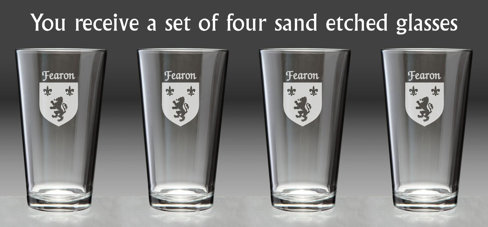 Fearon Irish Coat of Arms Pint GlassesDid you know that the standard 20 oz. pint glass is enforced by the National Standards Authority of Ireland? A full Irish pint is a tradition (and a duty). The Irish Rose can etch over 1000 Irish family names and authentic coats of arms on these high-quality, recognizably Irish Pint Glasses. A perfect wedding, groomsman, reunion, any-occasion gift.20 oz., permanently sand-etched authentic Irish coat-of-arms, and dishwasher safe. Choose from over 1000 available family crests.Washing Instructions:Dishwasher and microwave safe. Authentic Irish Family Coat of Arms Over 25 years of Heraldry Research Set of 4 Irish Coat of Arms Pint Glasses (Sand Etched) High quality sand etching with extra heavy base capacity: 20 Ozmaterial: Glassproduct height: 6-3/8"bottom diameter: 2-1/2"top diameter: 3-3/4"