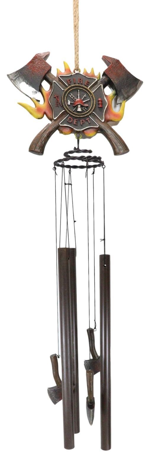 ? This particular wind chime features a heroic Maltese Cross crest with crossed axes and blazing fire at the backdrop. Attached to the sculptural crown are aluminum rods as well as mini ornaments of hand shovel tool and axes. This large sized wind chime is a perfect all in one gift for your hero!