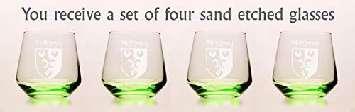 Product description: McKinney Irish Coat of Arms Green Tumbler Glasses - Set of 4 (Sand Etched). Whether you're having a glass of whiskey or scotch, a cocktail or just a glass of water, this brand new green tinted tumbler glass is the perfect choice. The new green color shines and reflects at different angles to beautifully remind you of the green pastures of Ireland with every sip. Each Irish coat of arms tumbler glass is permanently and professionally sand-etched with your surname and family crest. 13 oz. Choose from over 1000 available coat of arms.