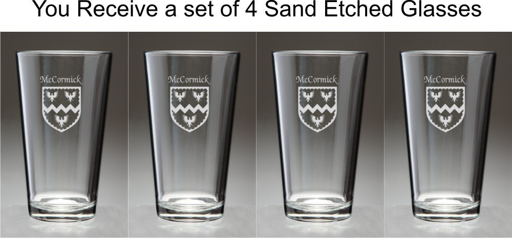 McCormick Irish Coat of Arms Pint GlassesDid you know that the standard 20 oz. pint glass is enforced by the National Standards Authority of Ireland? A full Irish pint is a tradition (and a duty). The Irish Rose can etch over 1000 Irish family names and authentic coats of arms on these high-quality, recognizably Irish Pint Glasses. A perfect wedding, groomsman, reunion, any-occasion gift.20 oz., permanently sand-etched authentic Irish coat-of-arms, and dishwasher safe. Choose from over 1000 available family crests.Washing Instructions:Dishwasher and microwave safe. Authentic Irish Family Coat of Arms Over 25 years of Heraldry Research Set of 4 Irish Coat of Arms Pint Glasses (Sand Etched) High quality sand etching with extra heavy base capacity: 20 Ozmaterial: Glassproduct height: 6-3/8"bottom diameter: 2-1/2"top diameter: 3-3/4"