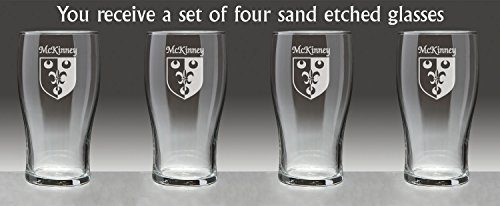 Product description: McKinney Irish Coat of Arms Tavern GlassesDanger: Curves ahead! From her hand-sized base to the gentle swell of her keel, this style of glassware is an age-old tradition on oaken bars all over the Celtic isles because of the wonderful balance, weight and durability she brings to the table.An official standard Irish pint at 20 oz., the Coat of Arms Tavern Glass features your permanently sand-etched Irish family coat of arms. Microwave and dishwasher safe.Choose from over 1200 available family Irish crests. Authentic Irish Family Coat of Arms Over 25 years of Heraldry Research Set of 4 Irish Coat of Arms Tavern Glasses (Sand Etched) High quality sand etchingEach glass holds 20 ounces of your favorite beverage