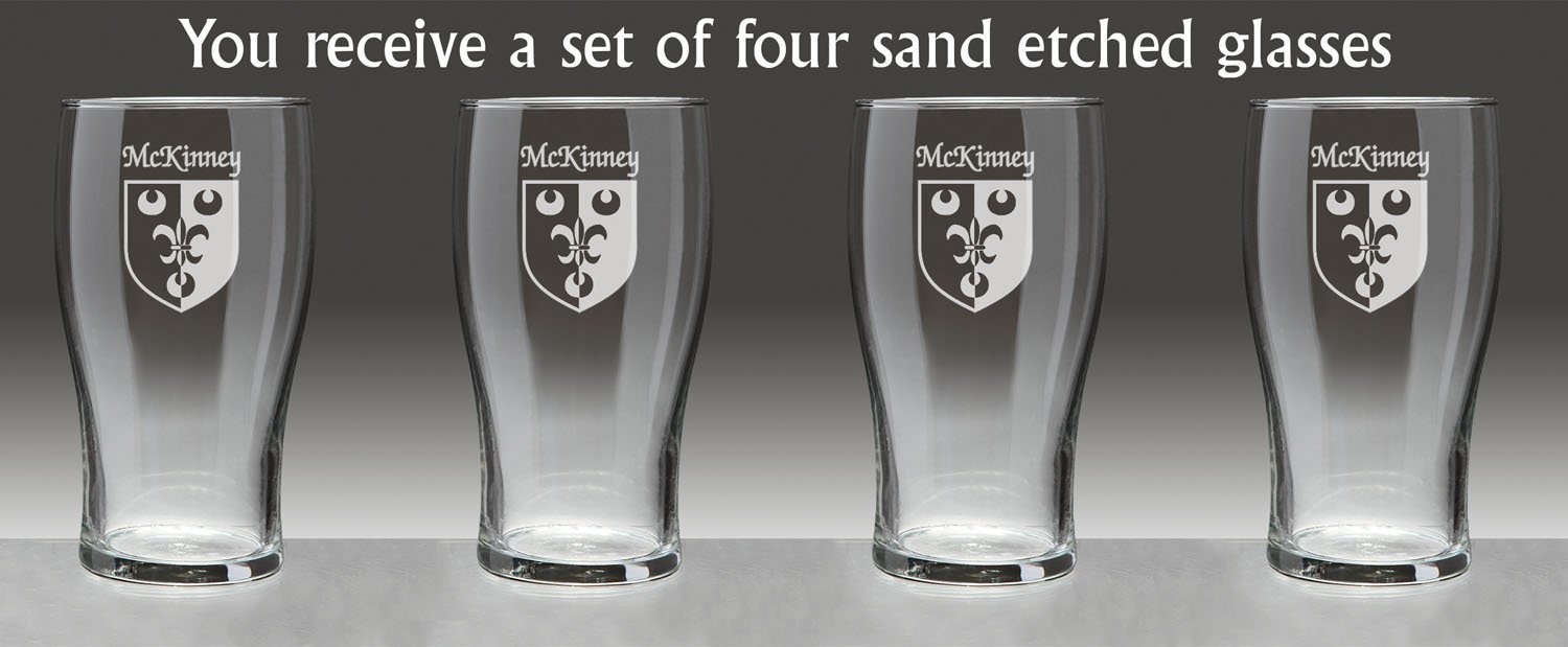 McKinney Irish Coat of Arms Tavern GlassesDanger: Curves ahead! From her hand-sized base to the gentle swell of her keel, this style of glassware is an age-old tradition on oaken bars all over the Celtic isles because of the wonderful balance, weight and durability she brings to the table.An official standard Irish pint at 20 oz., the Coat of Arms Tavern Glass features your permanently sand-etched Irish family coat of arms. Microwave and dishwasher safe.Choose from over 1200 available family Irish crests. Authentic Irish Family Coat of Arms Over 25 years of Heraldry Research Set of 4 Irish Coat of Arms Tavern Glasses (Sand Etched) High quality sand etchingEach glass holds 20 ounces of your favorite beverage