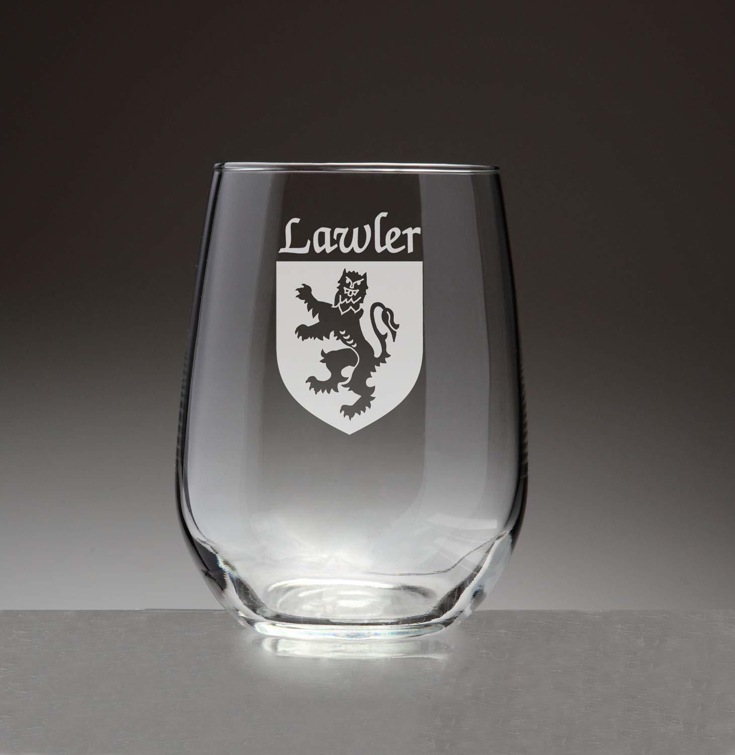 Lawler Irish Coat of Arms Stemless Wine Glass Set - Set of 4 (Sand Etched). People choose stemless wine glasses for many reasons. Some love the way it provides a handhold to look, swirl, smell and taste fine wine. Others appreciate the way it looks on the table. This new shape in wineglasses is growing in popularity. Add your authentic Irish name and coat of arms, finely etched on each glass, and it becomes a truly unique and modern heirloom. For your most special occasions, or everyday weekday dinners, choose this durable, well-balanced and elegant wine glass, suitable for white or red. Each Irish coat of arms wine glass is permanently and professionaly sand-etched with your surname and family crest. Choose from over 1000 available coat of arms. Dishwasher and microwave safe. Authentic Irish Family Coat of Arm. Over 25 years of Heraldry Research. Set of 4 Irish Coat of Arms Stemless wine Glasses. High quality sand etching. Each glass holds 15 1/2 ounces of your favorite beverage.