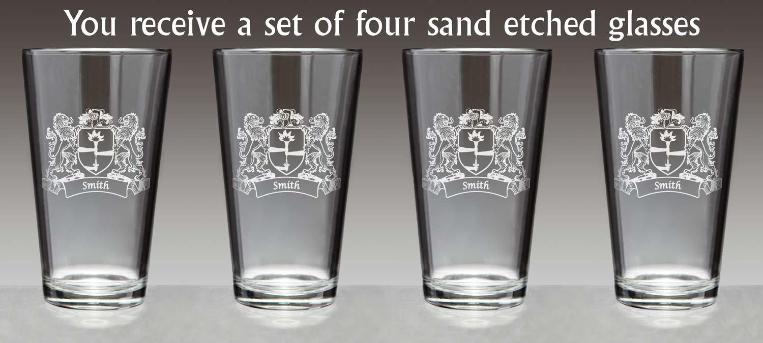 Smith Irish Coat of Arms Pint Glasses - Set of 4 (Sand etched) with our full coat of arms with lions and all. Did you know that the standard 20 oz. pint glass is enforced by the National Standards Authority of Ireland? A full Irish pint is a tradition (and a duty). The Irish Rose can etch over 1000 Irish family names and authentic coats of arms on these high-quality, recognizably Irish Pint Glasses. A perfect wedding, groomsman, reunion, any-occasion gift. Choose from over 1000 available family crests. Authentic Irish Family Coat of Arms. Over 25 years of Heraldry Research. Set of 4 Irish Coat of Arms Pint Glasses (Sand Etched). High quality sand etching with extra heavy base.capacity: 20 Oz. Product height: 6-3/8". Bottom diameter: 2-1/2". Top diameter: 3-3/4".