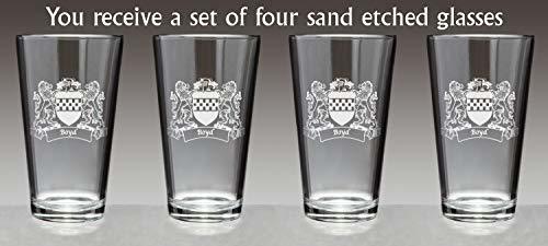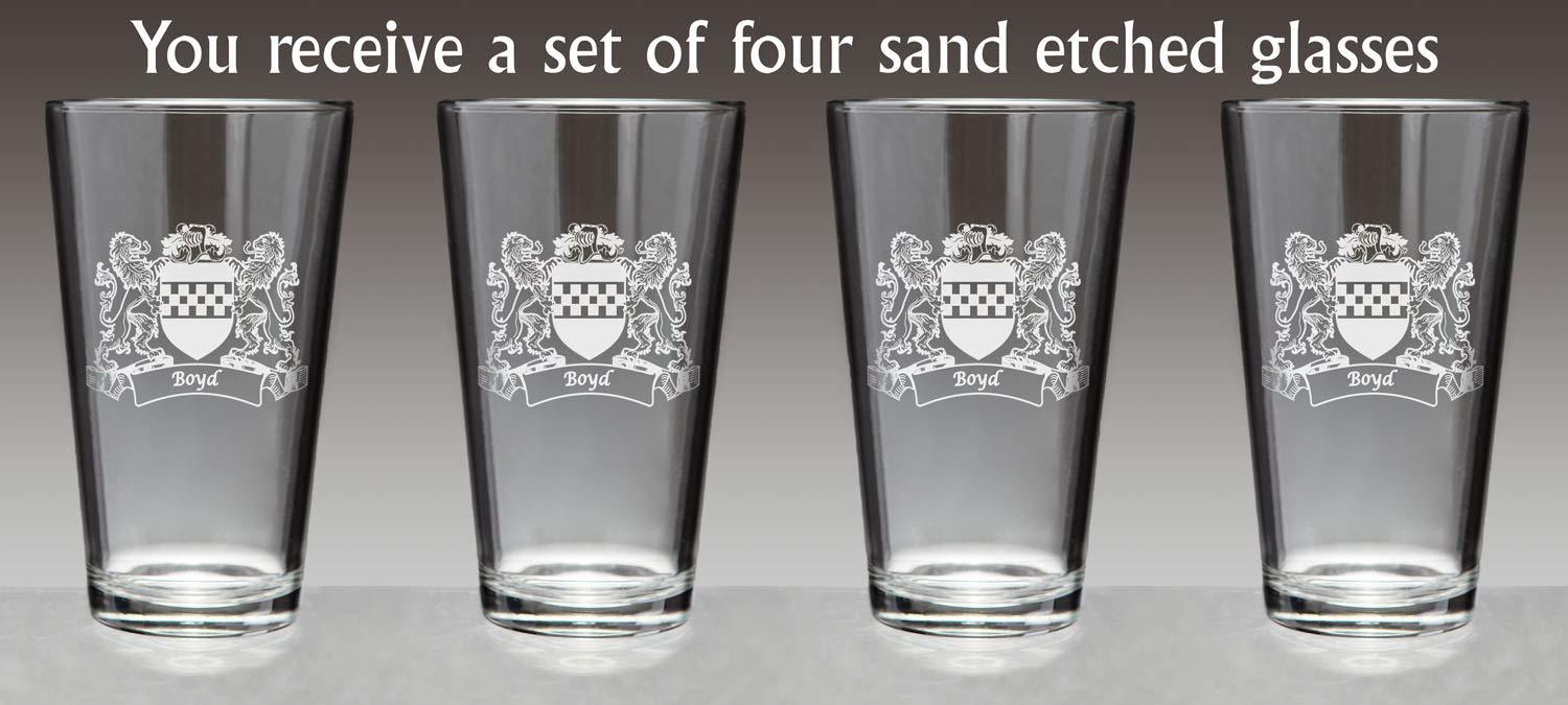 Boyd Irish Coat of Arms Pint Glasses - Set of 4 (Sand etched) with our full coat of arms with lions and all. Did you know that the standard 20 oz. pint glass is enforced by the National Standards Authority of Ireland? A full Irish pint is a tradition (and a duty). The Irish Rose can etch over 1000 Irish family names and authentic coats of arms on these high-quality, recognizably Irish Pint Glasses. A perfect wedding, groomsman, reunion, any-occasion gift. Choose from over 1000 available family crests. Authentic Irish Family Coat of Arms. Over 25 years of Heraldry Research. Set of 4 Irish Coat of Arms Pint Glasses (Sand Etched). High quality sand etching with extra heavy base.capacity: 20 Oz. Product height: 6-3/8". Bottom diameter: 2-1/2". Top diameter: 3-3/4".