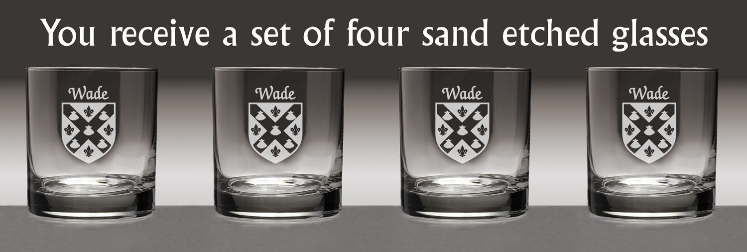 Wade Irish Coat of Arms Tumbler Glasses If ye'll be havin' a wee bit of the Jameson whiskey on a cool evening, this will be the glass. Or Scotch, neat. A Cosmopolitan, perhaps. Or just a spot of lemonade, for that matter. Nicely balanced, clean-lined and just plain grown-up, the Tumbler's dignity is heightened by a sand-etched Irish coat of arms and family name. Why not yours? 11 oz. in size and dishwasher safe. Choose from over 1000 available Irish crests. USA.Washing Instructions:Dishwasher and microwave safe. Authentic Irish Family Coat of Arms Over 25 years of Heraldry Research Set of 4 Irish Coat of Arms Tumbler Glasses (Sand Etched) High quality sand etching with extra heavy basepattern:heavy basebottom diameter:3-3/16"maximum diameter:3-1/4"capacity:11 oz product height:3-1/2"
