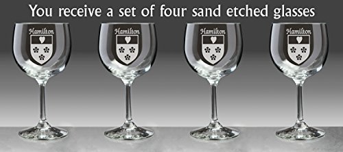 Hamilton Irish Coat of Arms Red Wine Glasses We couldn't pick just any red wine glass to carry your Irish family coat of arms. This stemware set contains four wonderfully-sized, exquisitely-balanced, stemmed wine glasses. Equally at home with red or white wine, but ideal for red wines, with elegant proportions but a robust constitution. Sand-etched with your surname and coat of arms. The ideal gift for anyone with an Irish branch on their family tree. 13 1/2 oz., and permanently sand-etched image. Choose from over 1200 available coat of arms. Authentic Irish Family Coat of Arms Over 25 years of Heraldry Research Set of 4 Irish Coat of Arms Red wine Glasses (Sand Etched) High quality sand etching Each glass holds 13 1/2 ounces of your Wine Washing Instructions:Dishwasher and microwave safe. Beadless, polished Dura-Temp edgeEnhanced bowl thickness for extra durabilityBottom diameter: 3-1/4"Maximum diameter: 3-5/8"Capacity: 13-1/2 ozProduct height: 6-7/8"Material: glassColor: clearTop diameter: 3-1/4"