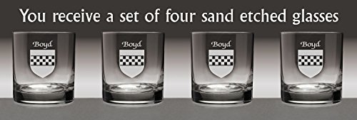 Product description: Boyd Irish Coat of Arms Tumbler Glasses If ye'll be havin' a wee bit of the Jameson whiskey on a cool evening, this will be the glass. Or Scotch, neat. A Cosmopolitan, perhaps. Or just a spot of lemonade, for that matter. Nicely balanced, clean-lined and just plain grown-up, the Tumbler's dignity is heightened by a sand-etched Irish coat of arms and family name. Why not yours? 11 oz. in size and dishwasher safe. Choose from over 1000 available Irish crests. USA.Washing Instructions:Dishwasher and microwave safe. Authentic Irish Family Coat of Arms Over 25 years of Heraldry Research Set of 4 Irish Coat of Arms Tumbler Glasses (Sand Etched) High quality sand etching with extra heavy basepattern:heavy basebottom diameter:3-3/16"maximum diameter:3-1/4"capacity:11 oz product height:3-1/2"