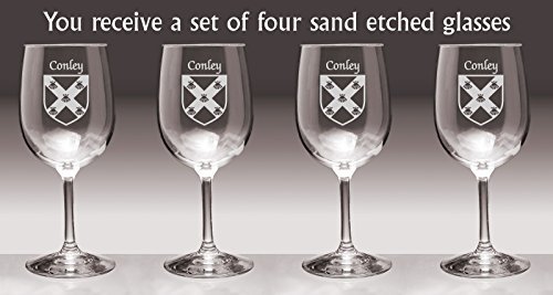 Product description: Conley Irish Coat of Arms Wine GlassesWhat occasion couldn't be made more special with a toast? And how special would it be to toast with wine glasses etched with your authentic Irish name and coat of arms? For your most special occasions, or everyday weekday dinners, choose this durable, well-balanced and elegant wine glass, suitable for white or red. Each Irish coat of arms wine glass is permanently and professionaly sand-etched with your surname and family crest. 13 oz. Choose from over 1000 available coat of arms.Washing Instructions:Dishwasher and microwave safe. Authentic Irish Family Coat of Arms Over 25 years of Heraldry Research Set of 4 Irish Coat of Arms Wine Glasses (Sand Etched) High quality sand etching Each glass holds 13 ounces of your favorite Wine+Product height: 7-1/2"Maximum diameter: 3-3/8"Top diameter: 2-7/8"Bottom diameter: 3-1/4"