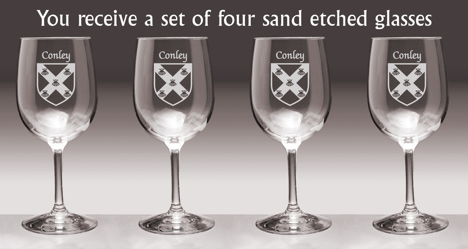 Conley Irish Coat of Arms Wine GlassesWhat occasion couldn't be made more special with a toast? And how special would it be to toast with wine glasses etched with your authentic Irish name and coat of arms? For your most special occasions, or everyday weekday dinners, choose this durable, well-balanced and elegant wine glass, suitable for white or red. Each Irish coat of arms wine glass is permanently and professionaly sand-etched with your surname and family crest. 13 oz. Choose from over 1000 available coat of arms.Washing Instructions:Dishwasher and microwave safe. Authentic Irish Family Coat of Arms Over 25 years of Heraldry Research Set of 4 Irish Coat of Arms Wine Glasses (Sand Etched) High quality sand etching Each glass holds 13 ounces of your favorite Wine+Product height: 7-1/2"Maximum diameter: 3-3/8"Top diameter: 2-7/8"Bottom diameter: 3-1/4"