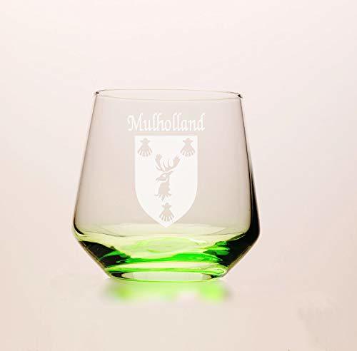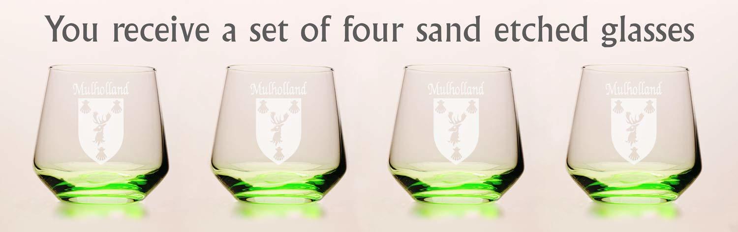 Product description: Mulholland Irish Coat of Arms Green Tumbler Glasses - Set of 4 (Sand Etched). Whether you're having a glass of whiskey or scotch, a cocktail or just a glass of water, this brand new green tinted tumbler glass is the perfect choice. The new green color shines and reflects at different angles to beautifully remind you of the green pastures of Ireland with every sip. Each Irish coat of arms tumbler glass is permanently and professionally sand-etched with your surname and family crest. 13 oz. Choose from over 1000 available coat of arms.