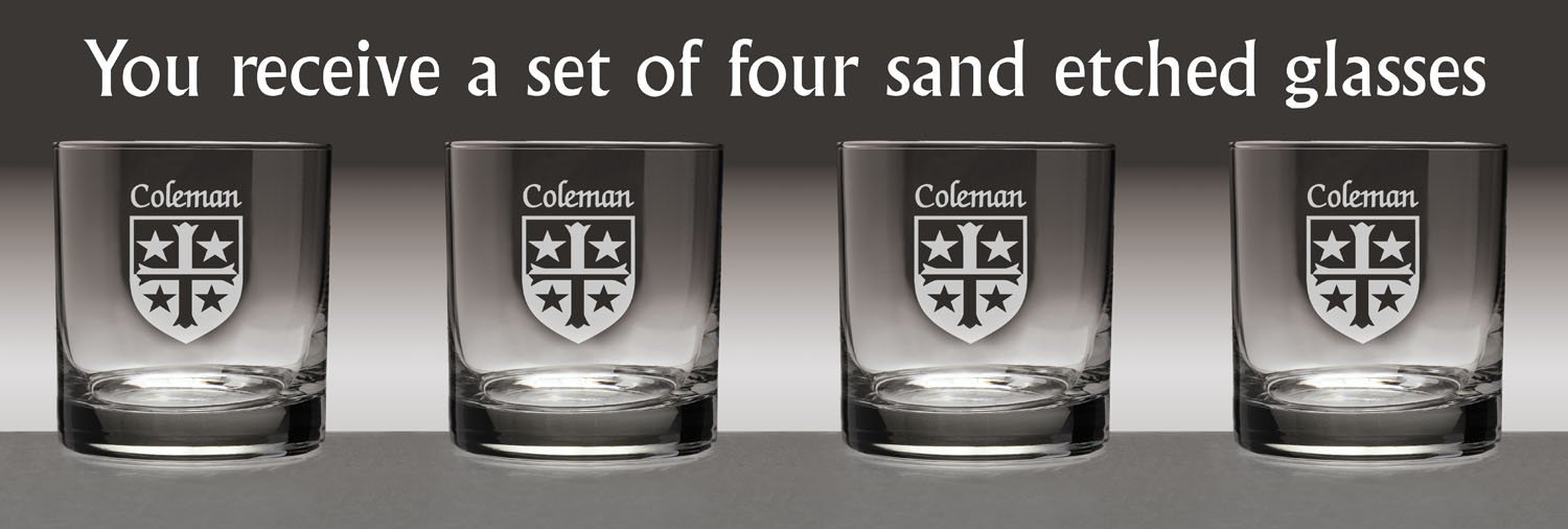 Coleman Irish Coat of Arms Tumbler Glasses If ye'll be havin' a wee bit of the Jameson whiskey on a cool evening, this will be the glass. Or Scotch, neat. A Cosmopolitan, perhaps. Or just a spot of lemonade, for that matter. Nicely balanced, clean-lined and just plain grown-up, the Tumbler's dignity is heightened by a sand-etched Irish coat of arms and family name. Why not yours? 11 oz. in size and dishwasher safe. Choose from over 1000 available Irish crests. USA.Washing Instructions:Dishwasher and microwave safe. Authentic Irish Family Coat of Arms Over 25 years of Heraldry Research Set of 4 Irish Coat of Arms Tumbler Glasses (Sand Etched) High quality sand etching with extra heavy basepattern:heavy basebottom diameter:3-3/16"maximum diameter:3-1/4"capacity:11 oz product height:3-1/2"