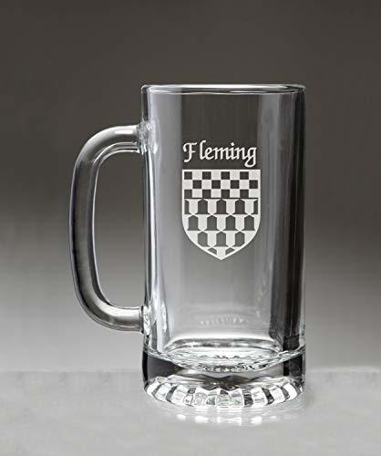Fleming Irish Coat of Arms Beer Mug . This is the big beer mug with the handle that allows you to swing your glass while you're singing that Irish song. Or maybe just to have a drink with a heavy handled friend. High quality sand etched with your authentic Irish coat of arms and family name. Dishwasher and microwave safe. Capacity 16 oz and heavy duty double walled clear glass with handle. Choose from over 1200 available family Irish crests. Authentic Irish Family Coat of Arms. Over 25 years of Heraldry Research. Irish Coat of Arms Beer mug. High quality sand etching. Each glass holds 16 ounces of your favorite beverage.