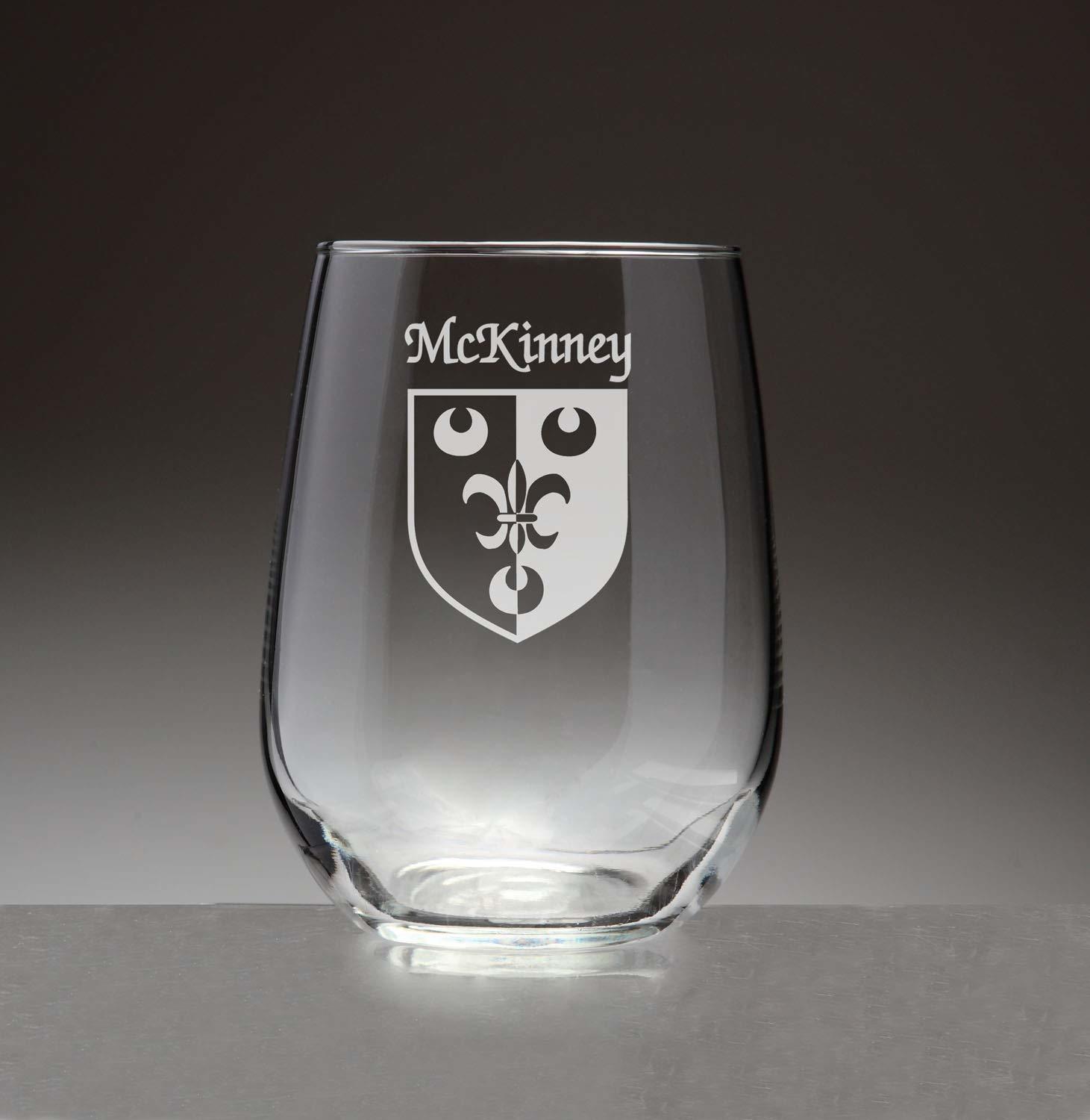 McKinney Irish Coat of Arms Stemless Wine Glass Set - Set of 4 (Sand Etched). People choose stemless wine glasses for many reasons. Some love the way it provides a handhold to look, swirl, smell and taste fine wine. Others appreciate the way it looks on the table. This new shape in wineglasses is growing in popularity. Add your authentic Irish name and coat of arms, finely etched on each glass, and it becomes a truly unique and modern heirloom. For your most special occasions, or everyday weekday dinners, choose this durable, well-balanced and elegant wine glass, suitable for white or red. Each Irish coat of arms wine glass is permanently and professionaly sand-etched with your surname and family crest. Choose from over 1000 available coat of arms. Dishwasher and microwave safe. Authentic Irish Family Coat of Arm. Over 25 years of Heraldry Research. Set of 4 Irish Coat of Arms Stemless wine Glasses. High quality sand etching. Each glass holds 15 1/2 ounces of your favorite beverage.
