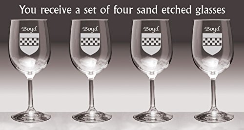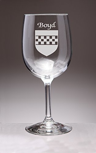 Boyd Irish Coat of Arms Wine GlassesWhat occasion couldn't be made more special with a toast? And how special would it be to toast with wine glasses etched with your authentic Irish name and coat of arms? For your most special occasions, or everyday weekday dinners, choose this durable, well-balanced and elegant wine glass, suitable for white or red. Each Irish coat of arms wine glass is permanently and professionaly sand-etched with your surname and family crest. 13 oz. Choose from over 1000 available coat of arms.Washing Instructions:Dishwasher and microwave safe. Authentic Irish Family Coat of Arms Over 25 years of Heraldry Research Set of 4 Irish Coat of Arms Wine Glasses (Sand Etched) High quality sand etching Each glass holds 13 ounces of your favorite Wine+Product height: 7-1/2"Maximum diameter: 3-3/8"Top diameter: 2-7/8"Bottom diameter: 3-1/4"
