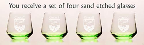 Product description: Connell Irish Coat of Arms Green Tumbler Glasses - Set of 4 (Sand Etched). Whether you're having a glass of whiskey or scotch, a cocktail or just a glass of water, this brand new green tinted tumbler glass is the perfect choice. The new green color shines and reflects at different angles to beautifully remind you of the green pastures of Ireland with every sip. Each Irish coat of arms tumbler glass is permanently and professionally sand-etched with your surname and family crest. 13 oz. Choose from over 1000 available coat of arms.