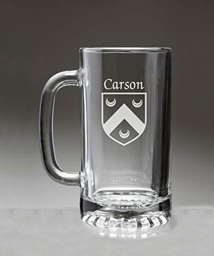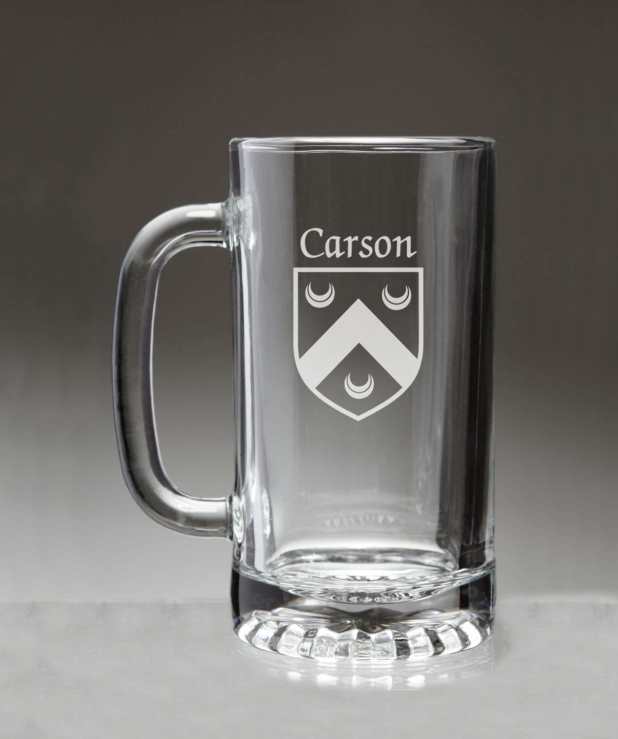 Carson Irish Coat of Arms Beer Mug . This is the big beer mug with the handle that allows you to swing your glass while you're singing that Irish song. Or maybe just to have a drink with a heavy handled friend. High quality sand etched with your authentic Irish coat of arms and family name. Dishwasher and microwave safe. Capacity 16 oz and heavy duty double walled clear glass with handle. Choose from over 1200 available family Irish crests. Authentic Irish Family Coat of Arms. Over 25 years of Heraldry Research. Irish Coat of Arms Beer mug. High quality sand etching. Each glass holds 16 ounces of your favorite beverage.