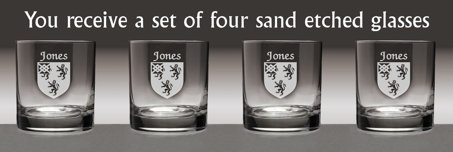 Jones Irish Coat of Arms Tumbler Glasses If ye'll be havin' a wee bit of the Jameson whiskey on a cool evening, this will be the glass. Or Scotch, neat. A Cosmopolitan, perhaps. Or just a spot of lemonade, for that matter. Nicely balanced, clean-lined and just plain grown-up, the Tumbler's dignity is heightened by a sand-etched Irish coat of arms and family name. Why not yours? 11 oz. in size and dishwasher safe. Choose from over 1000 available Irish crests. USA.Washing Instructions:Dishwasher and microwave safe. Authentic Irish Family Coat of Arms Over 25 years of Heraldry Research Set of 4 Irish Coat of Arms Tumbler Glasses (Sand Etched) High quality sand etching with extra heavy basepattern:heavy basebottom diameter:3-3/16"maximum diameter:3-1/4"capacity:11 oz product height:3-1/2"