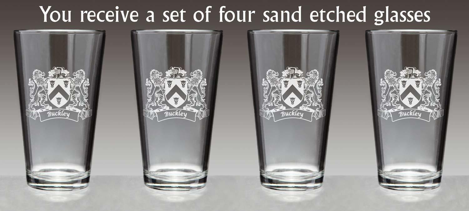 Buckley Irish Coat of Arms Pint Glasses - Set of 4 (Sand etched) with our full coat of arms with lions and all. Did you know that the standard 20 oz. pint glass is enforced by the National Standards Authority of Ireland? A full Irish pint is a tradition (and a duty). The Irish Rose can etch over 1000 Irish family names and authentic coats of arms on these high-quality, recognizably Irish Pint Glasses. A perfect wedding, groomsman, reunion, any-occasion gift. Choose from over 1000 available family crests. Authentic Irish Family Coat of Arms. Over 25 years of Heraldry Research. Set of 4 Irish Coat of Arms Pint Glasses (Sand Etched). High quality sand etching with extra heavy base.capacity: 20 Oz. Product height: 6-3/8". Bottom diameter: 2-1/2". Top diameter: 3-3/4".