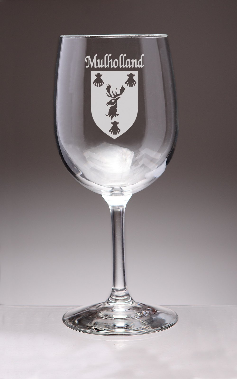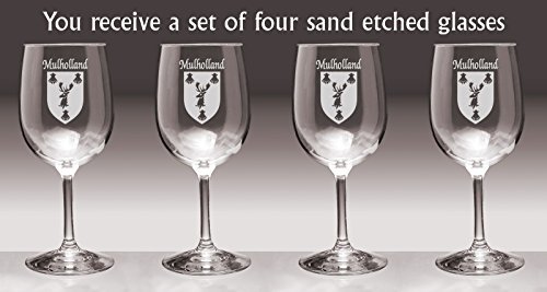 Mulholland Irish Coat of Arms Wine GlassesWhat occasion couldn't be made more special with a toast? And how special would it be to toast with wine glasses etched with your authentic Irish name and coat of arms? For your most special occasions, or everyday weekday dinners, choose this durable, well-balanced and elegant wine glass, suitable for white or red. Each Irish coat of arms wine glass is permanently and professionaly sand-etched with your surname and family crest. 13 oz. Choose from over 1000 available coat of arms.Washing Instructions:Dishwasher and microwave safe. Authentic Irish Family Coat of Arms Over 25 years of Heraldry Research Set of 4 Irish Coat of Arms Wine Glasses (Sand Etched) High quality sand etching Each glass holds 13 ounces of your favorite Wine+Product height: 7-1/2"Maximum diameter: 3-3/8"Top diameter: 2-7/8"Bottom diameter: 3-1/4"