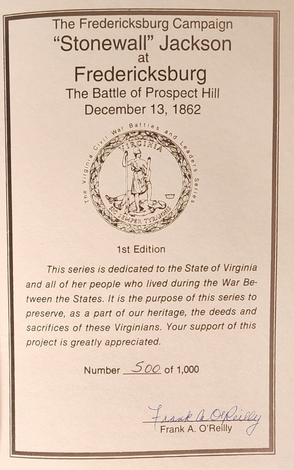 THE FREDERICKSBURG CAMPAIGN “STONEWALL” JACKSON AT FREDERICKSBURG - 1993 1st ed
