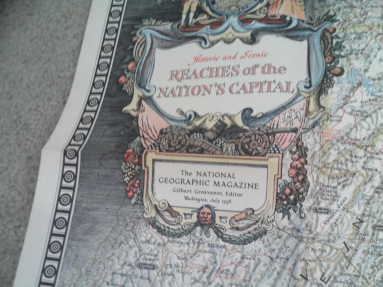 are bidding on a nice, large old, original 1938 dated, folded map from the National Geographic Society, a historical map of the Reaches of the Capital. About 26 1/2 inches tall, 31 inches wide. Light wear for a folded map with light wrinkles, great piece to frame. Zoom in for details.