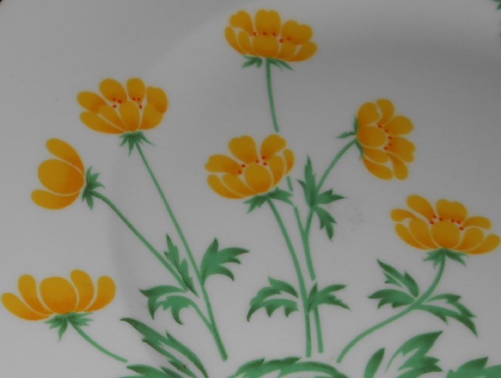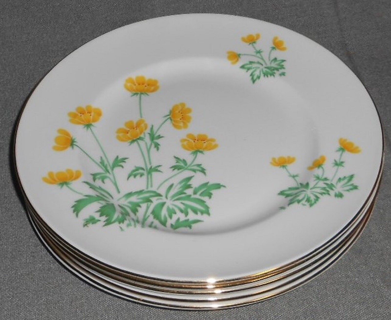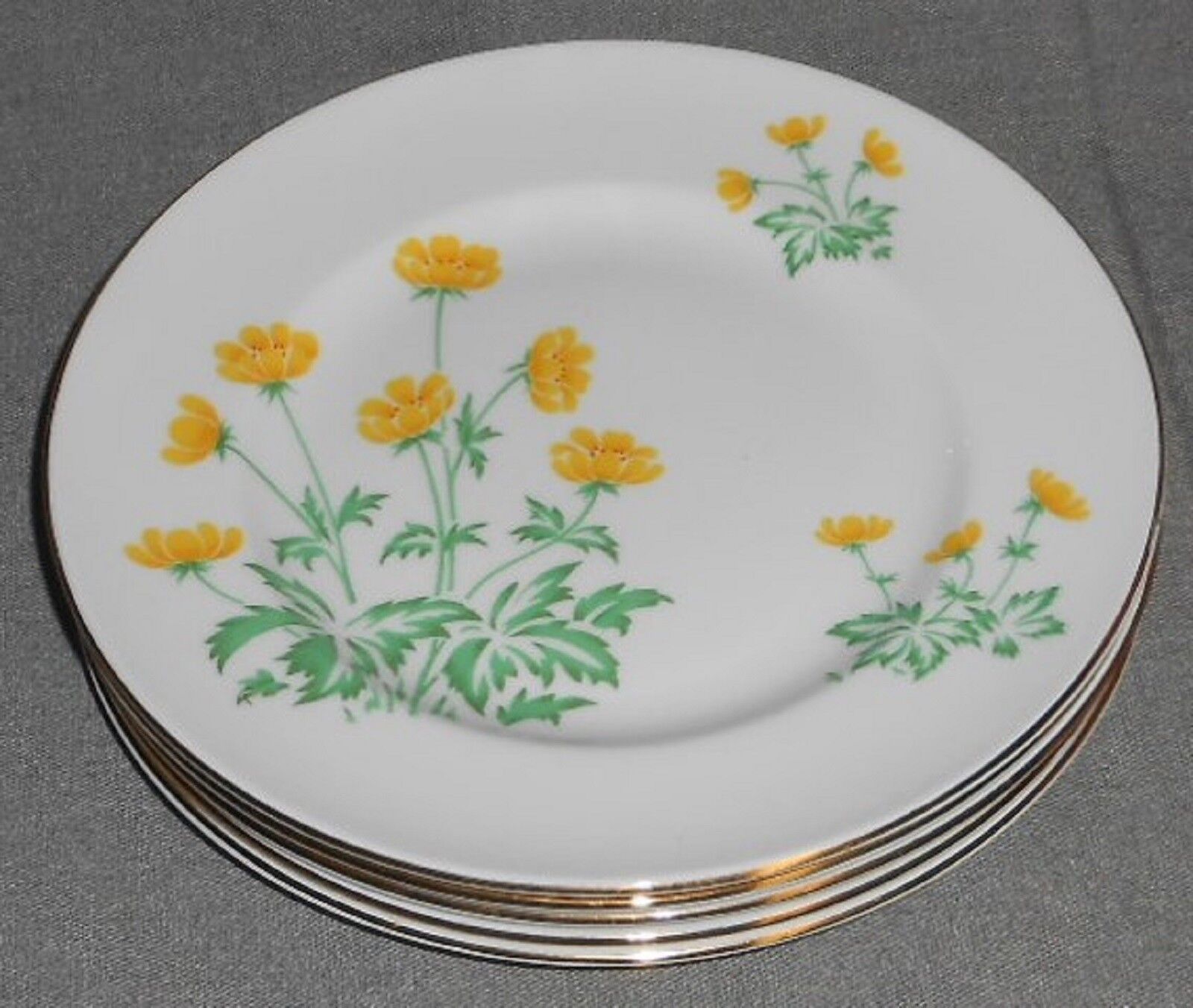 This is a Set of (5) Beautiful Bone China 8 1/4" Salad or Dessert Plates from Crown Sterling in the Surrey Buttercups Pattern and Made in England. They are all in good pre-owned condition with no chips or damage - gold trim on plates.
