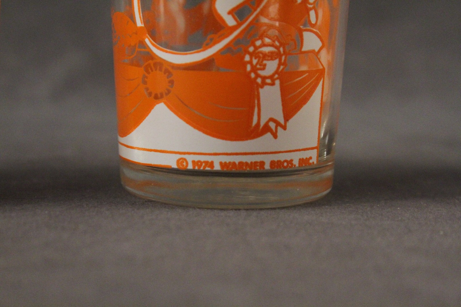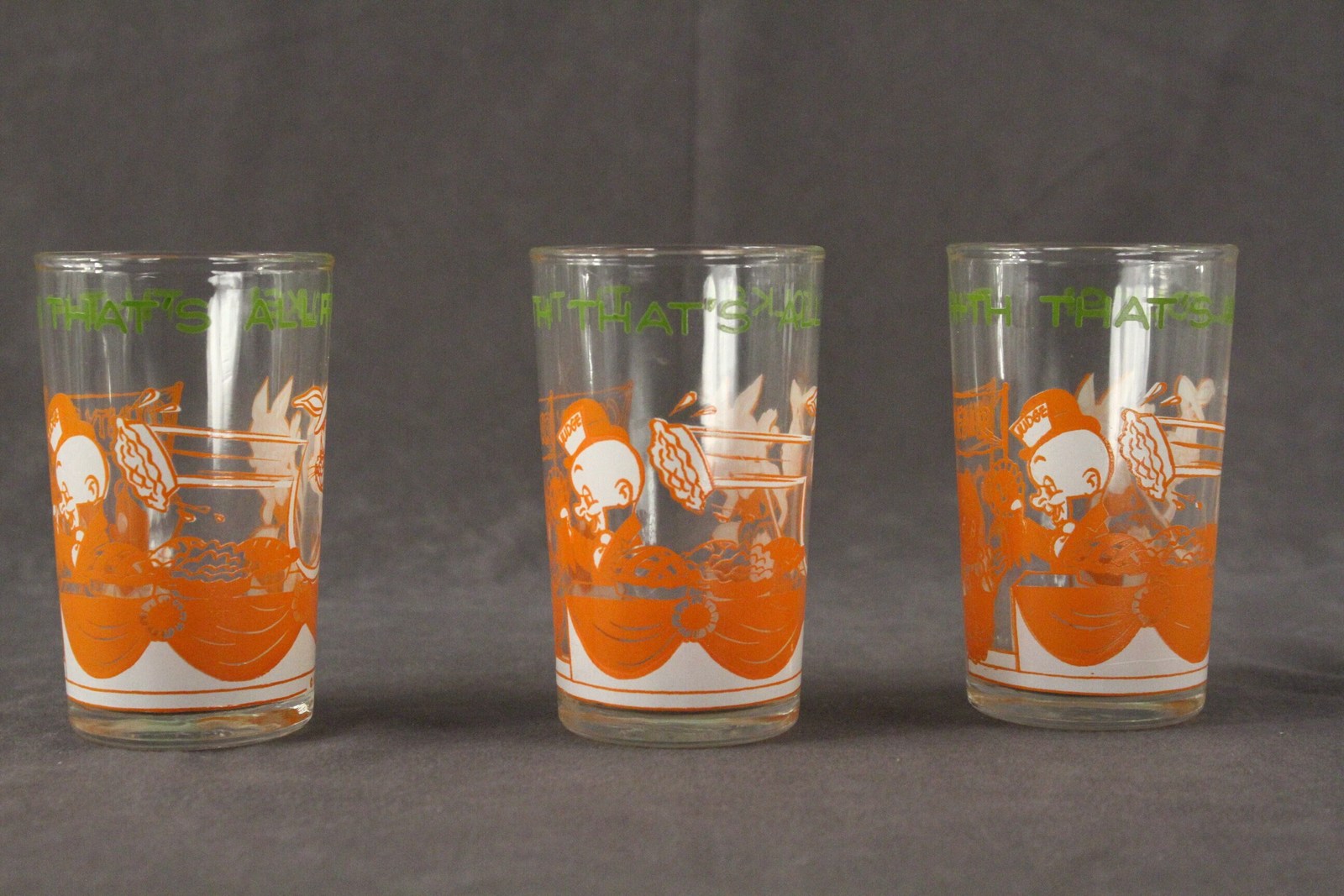 Lot 3 Vintage Tumblers 1974 Welch's Jelly Advertising Juice Glasses Looney Tunes Bugs Bunny Porky Pig That's All Folks. The impressed faces on the bottom of the glasses include Porky Pig, Bugs Bunny and Tweety Bird. Bright colors. The measure 4.25" tall. The opening diameter is 2.5". No chips or cracks. No smoke or pet odors. Colors bright. Handwashing is recommended.
