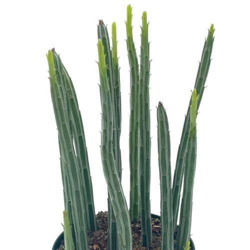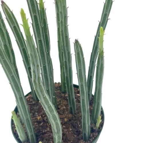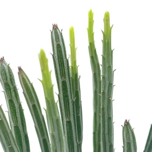 an interesting succulent with tiny scale leaves and pencil-like cylindrical stems. The stems are brittle and succulent, with soft spines (safe to touch) along the sides. It can grow up to 10 inches long and 0.8 inches thick.