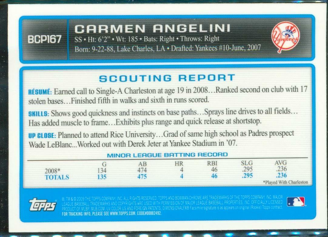 2009 Baseball Trading Card TOPPS Bowman Chrome Prospects BCP167 CARMEN ANGELINI New York Yankees - Shortstop