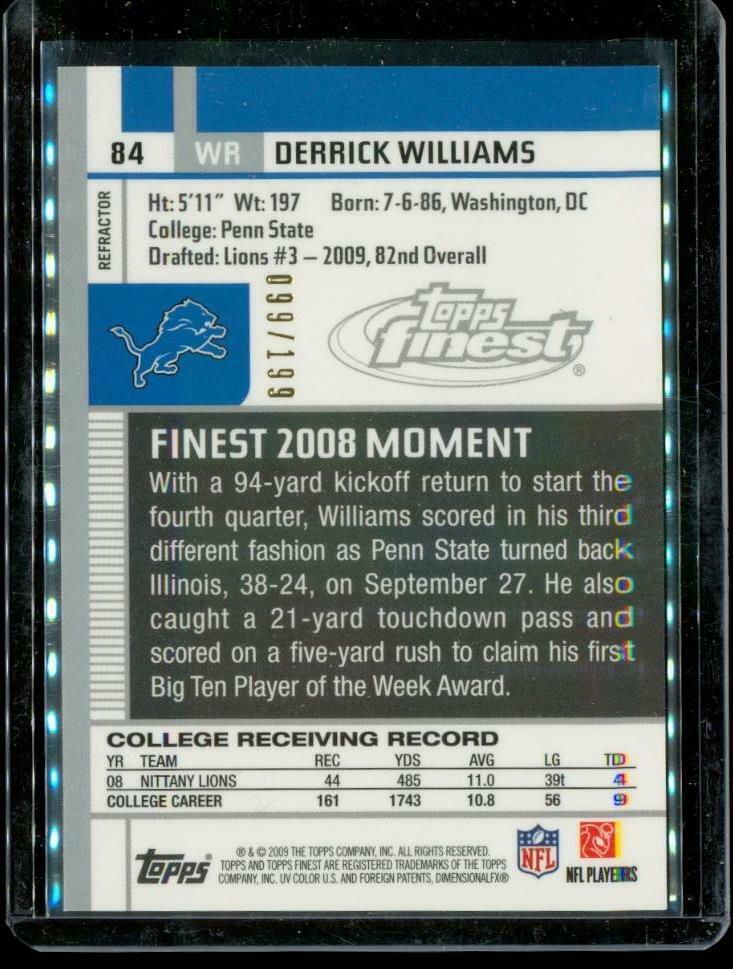 2009 TOPPS CHROME RC Refractor Football Card #84 DERRICK WILLIAMS Detroit Lions Limited Edition 099/199