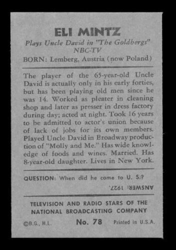 Vintage Bowman TV Radio NBC Trading Card 1953 ELI MINTZ #78 The Goldbergs