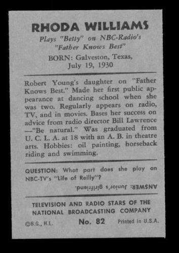 Vintage Bowman TV & Radio NBC Trading Card 1953 RHODA WILLIAMS #82 Father Knows
