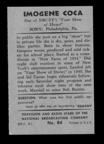 Vintage Bowman TV Radio NBC Trading Card 1953 IMOGENE COCA #84 Show of Shows. ? Crisp and clean. Bright colors.