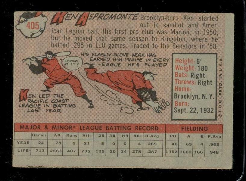 Vintage BASEBALL Trading Card TOPPS 1959 #405 KEN ASPROMONTE Washington Senators