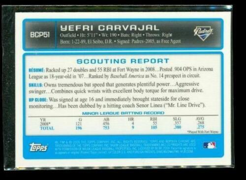 2009 TOPPS 1ST BOWMAN CHROME Baseball Card BCP51 YEFRI CARVAJAL San Diego Padres