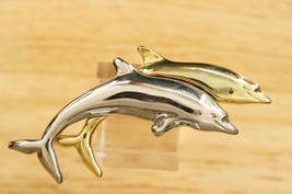 Vintage Costume Jewelry Liz Claiborne Silver Gold Swimming Dolphins Brooch Pin. Measures 3" long by 1.25" tall.
