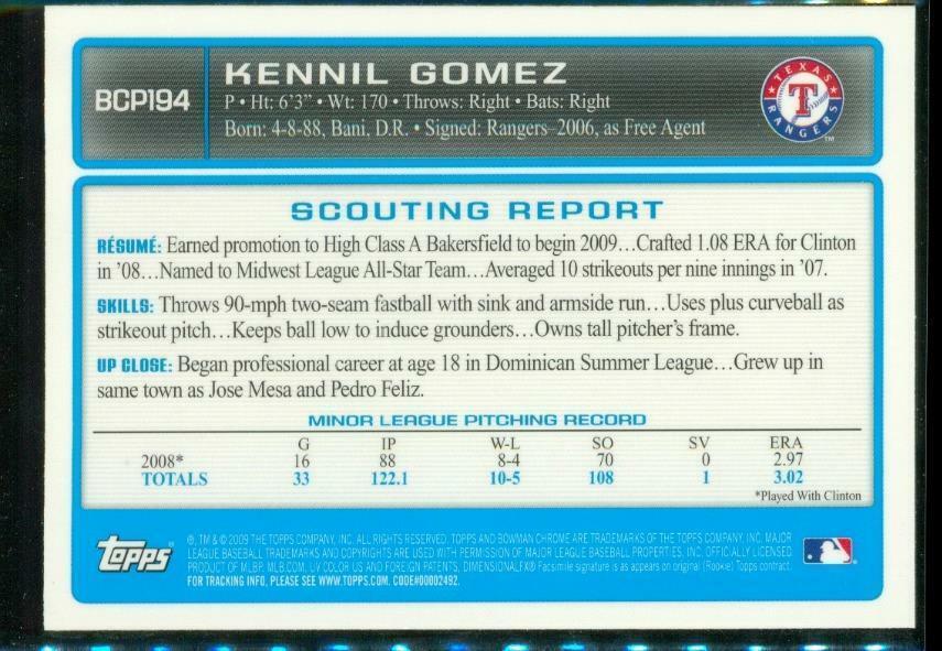2009 Baseball Trading Card TOPPS Bowman Chrome Prospects BCP194 KENNIL GOMEZ Texas Rangers - Pitcher