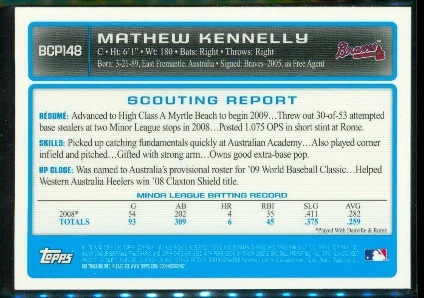 2009 Baseball Card Bowman Chrome Prospects BCP148 MATHEW KENNELLY Atlanta Braves