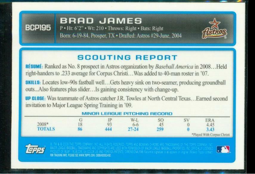 2009 Baseball Trading Card TOPPS Bowman Chrome Prospects BCP195 BRAD JAMES Houston Astros - Pitcher