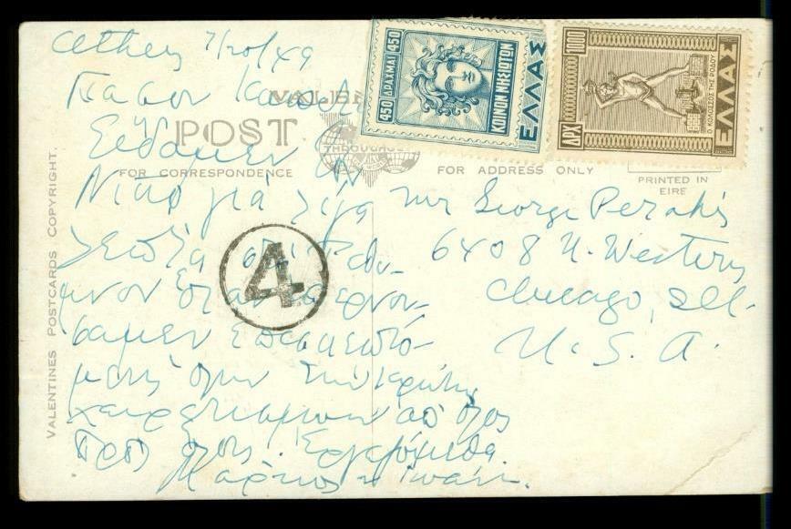 Vintage Postcard Greece to USA Postal History Islands Upper Lake Killarney