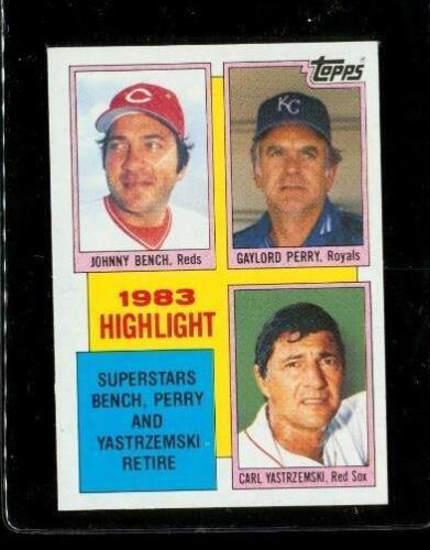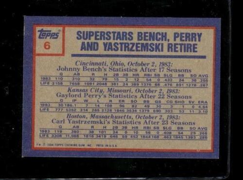 Vintage 1984 TOPPS HIGHLIGHT SUPERSTARS RETIRE Baseball Card #6 JOHNNY BENCH Cincinnati Reds, GAYLORD PERRY Kansas City Royals, CARL YASTRZEMSKI Boston Red Sox