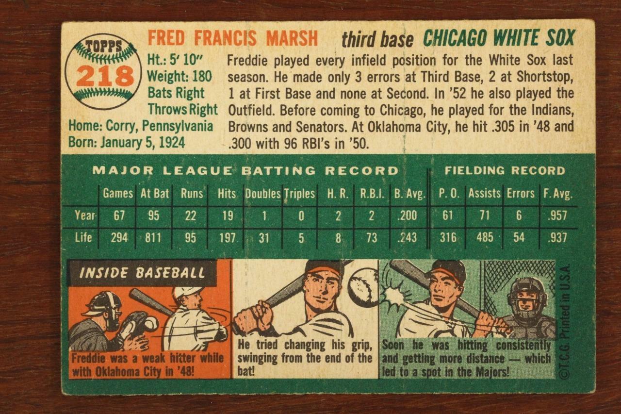 Vintage 1954 Baseball Card TOPPS #218 FRED MARSH Third Base Chicago White Sox. Browning, corner wear noted. You get the EXACT card shown in the photos.
