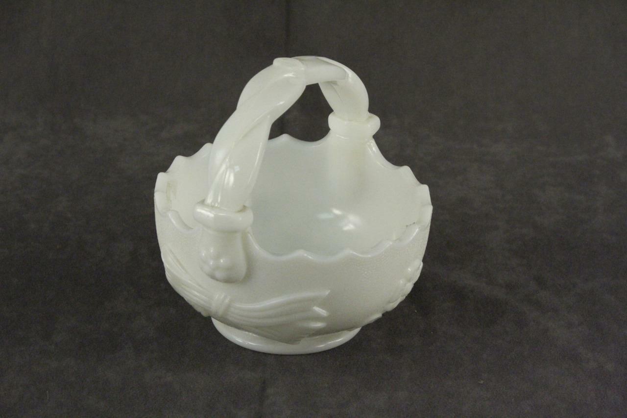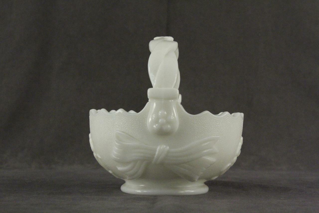 Vintage IMPERIAL Milk Glass Flower Floral Ribbon Textured Stipple Basket - stands 4.75" tall.