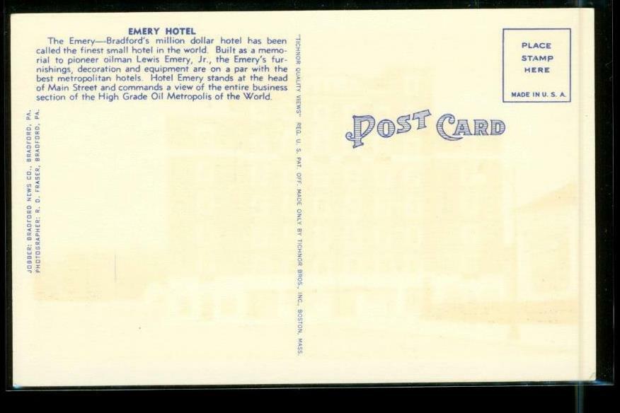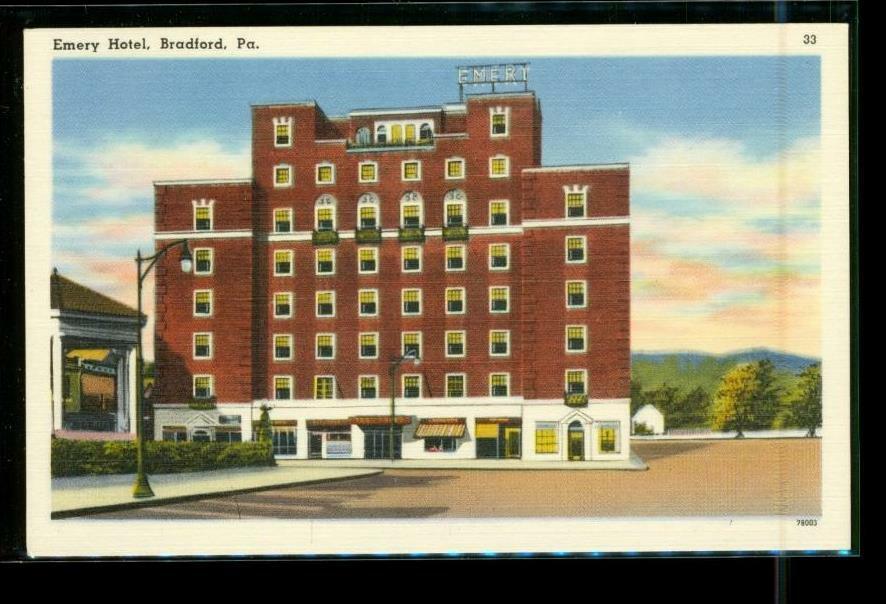 Vintage Linen Souvenir Postcard Emery Hotel Bradford Pennsylvania