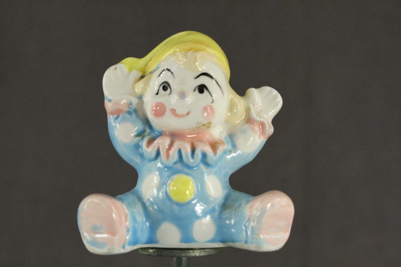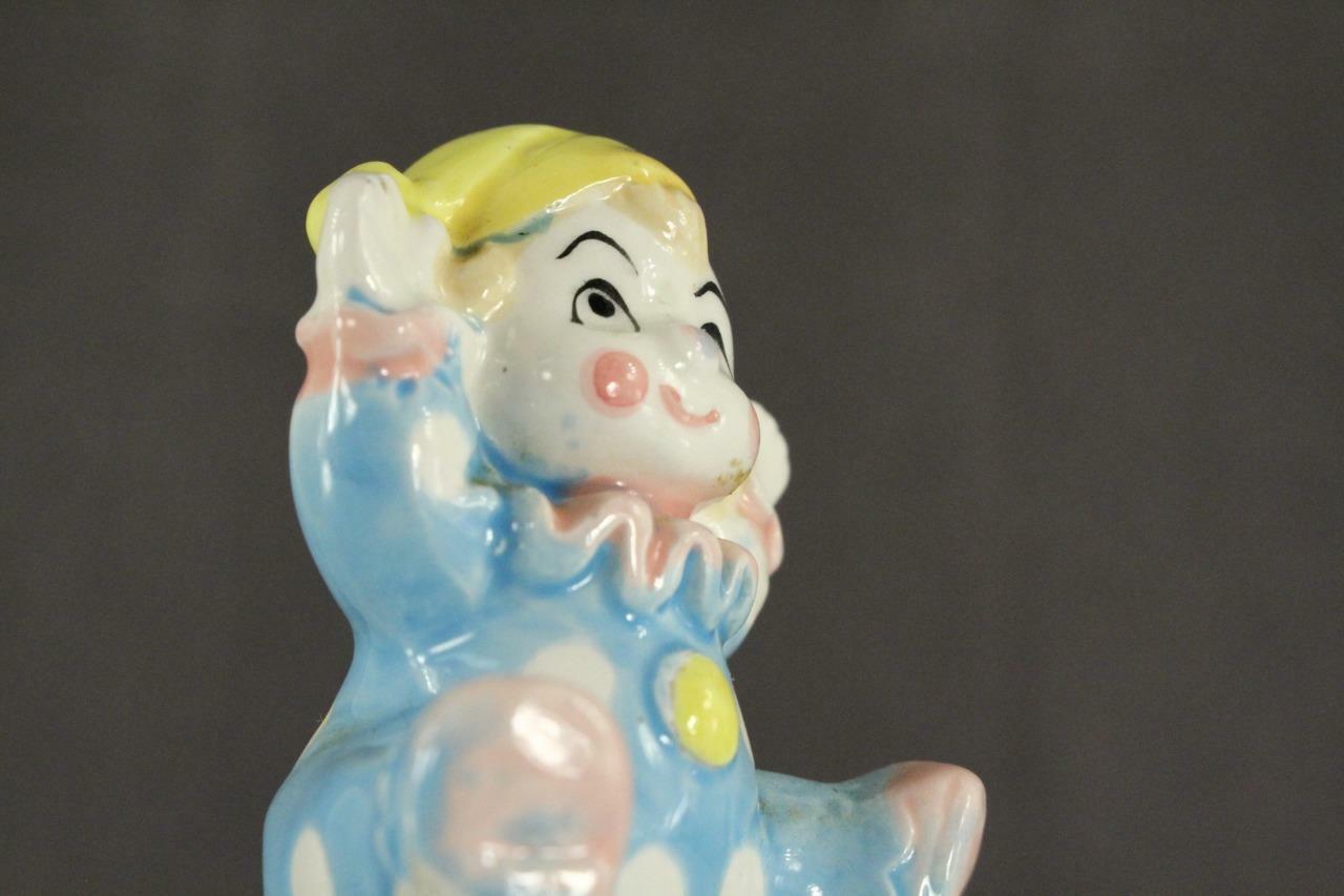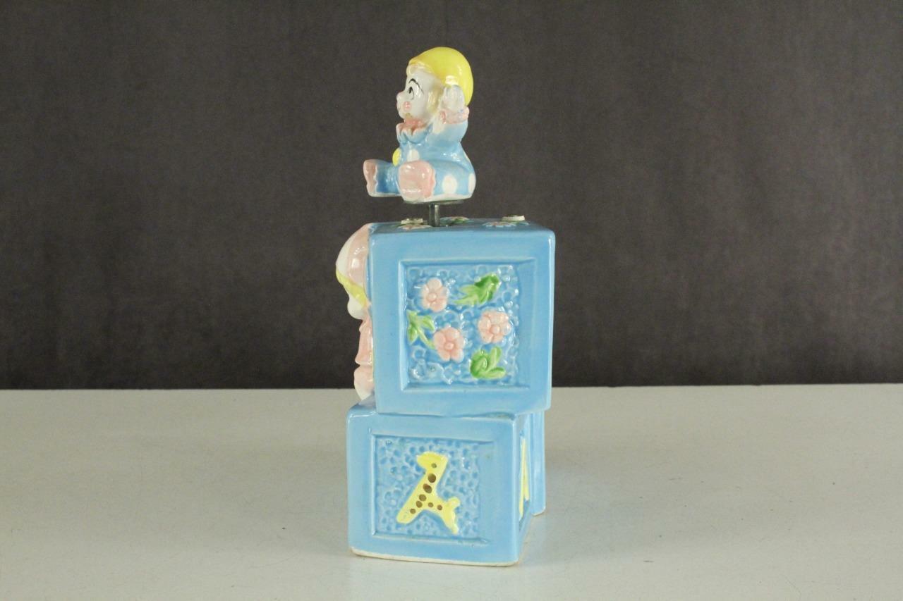Vintage Art Pottery Japan Ceramic BABY Blocks Blue Clown Musical Lullaby Planter - the clown winds and it plays lullaby music. Measures 8" tall. Needs a gentle soap and water clean. Great to fill with a flower or plant for a new baby gift. No smoke or pet odor. No chips or cracks. Made by Rubens.