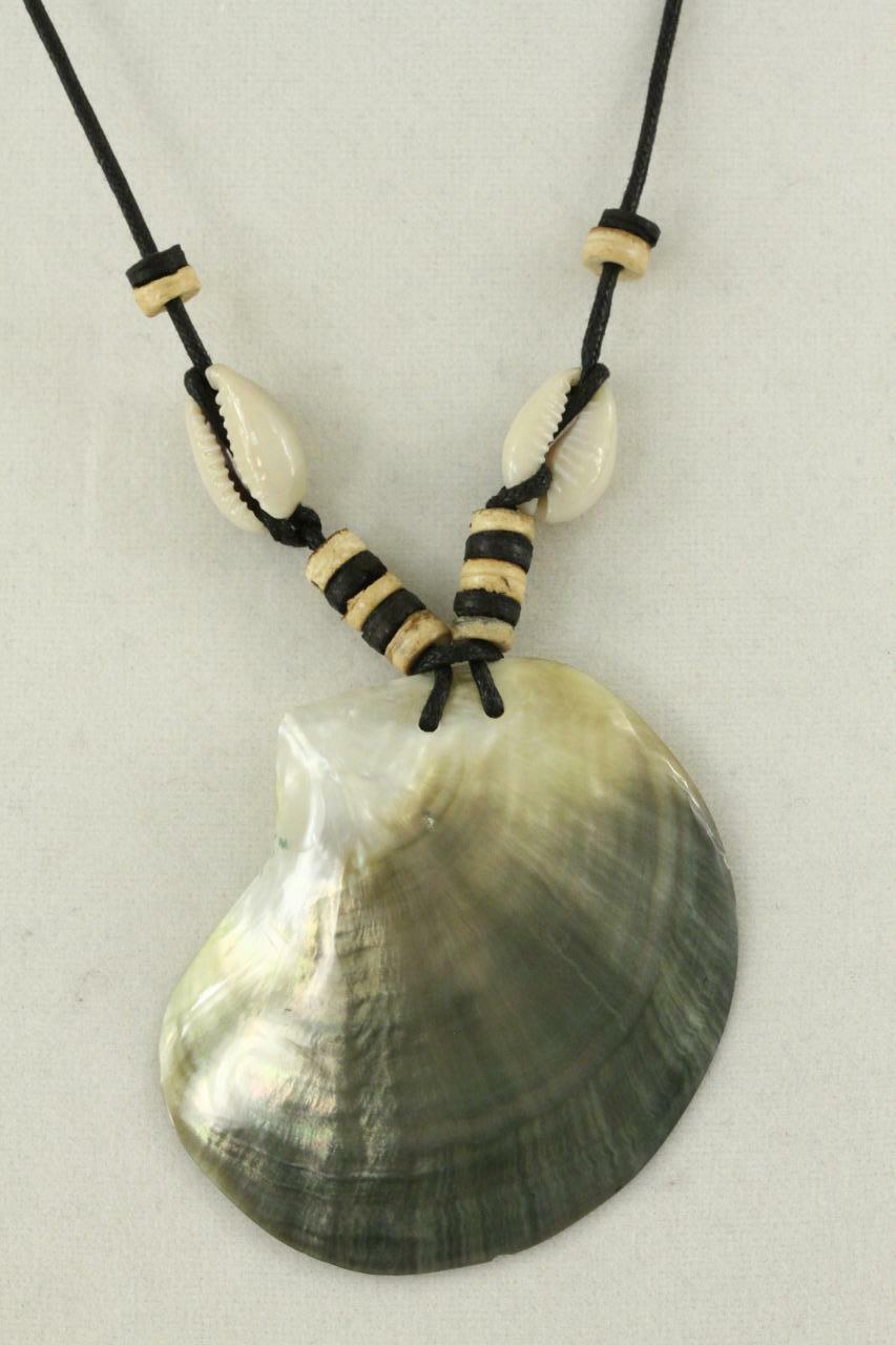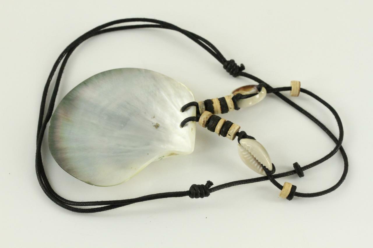 Vintage Costume Jewelry Leather Cord Cowrie Mother of Pearl Shell Necklace. Length: approx. 24", Shell height: 2.5", width: 2.5"
